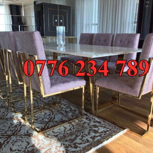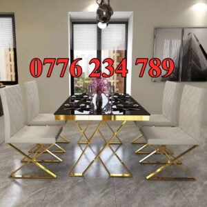 Bộ bàn ghế inox chữ nhật được sử dụng nhiều trong phòng ăn, phòng trưng bày, phòng làm việc với chân bàn được làm bằng inox mạ vàng cao cấp.