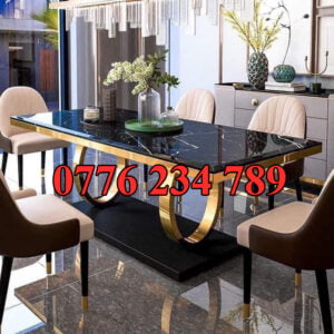 Ngoài mặt bàn được làm bằng đá cẩm thạch thì bàn ghế inox mặt kiếng cũng là một hoàn hảo.