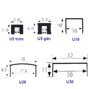 Kích thước: U3 (3x10mm), U5 (5x10mm), U8 (8x10mm), U10 (10x10mm), U15, U20, U30,… chiều dài tiêu chuẩn 2400mm (2m4) và độ dày 1mm